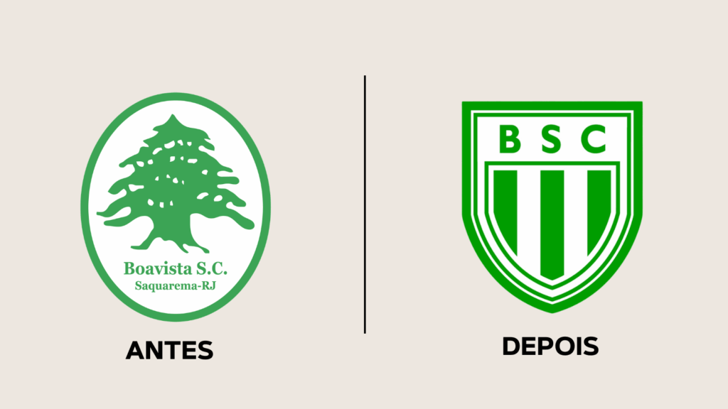 Outro exemplo vem do Boavista, de Saquarema (RJ). O clube trocou o escudo que trazia a icônica árvore do cedro-do-líbano, homenagem ao primeiro patrocinador, de origem libanesa, por um design mais limpo, com listras verticais em verde e branco e as iniciais “BSC”.